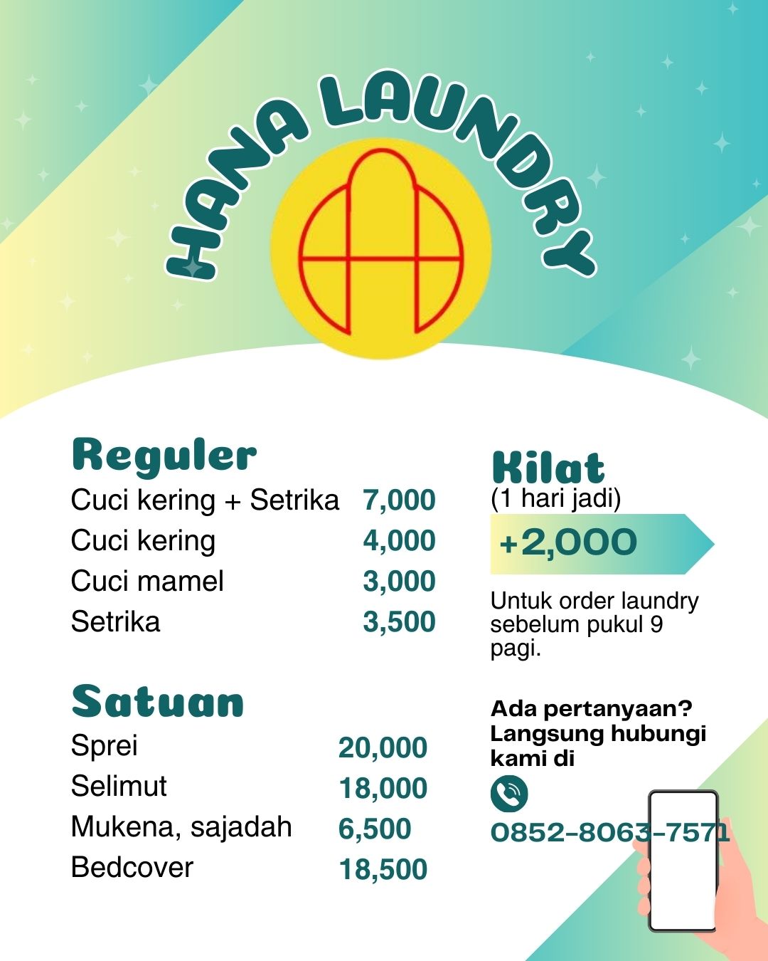 Dilengkapi dengan pilihan sabun laundry berkualitas yang juga kami jual, Hana Laundry cocok untuk kebutuhan rumah tangga maupun usaha kecil dan menengah. Apapun kebutuhan cucian Anda, serahkan pada kami. Praktis, bersih, dan terpercaya — cukup pesan dan kami siap melayani!